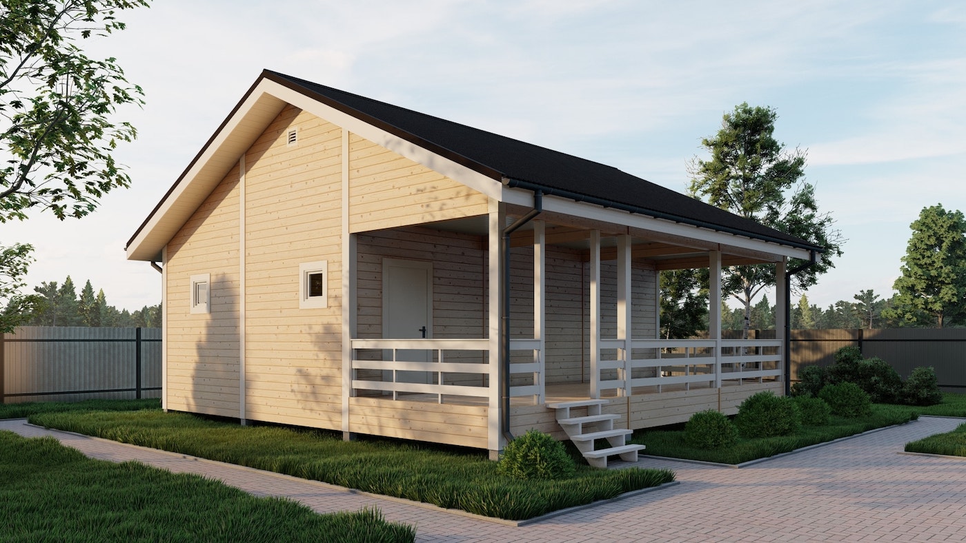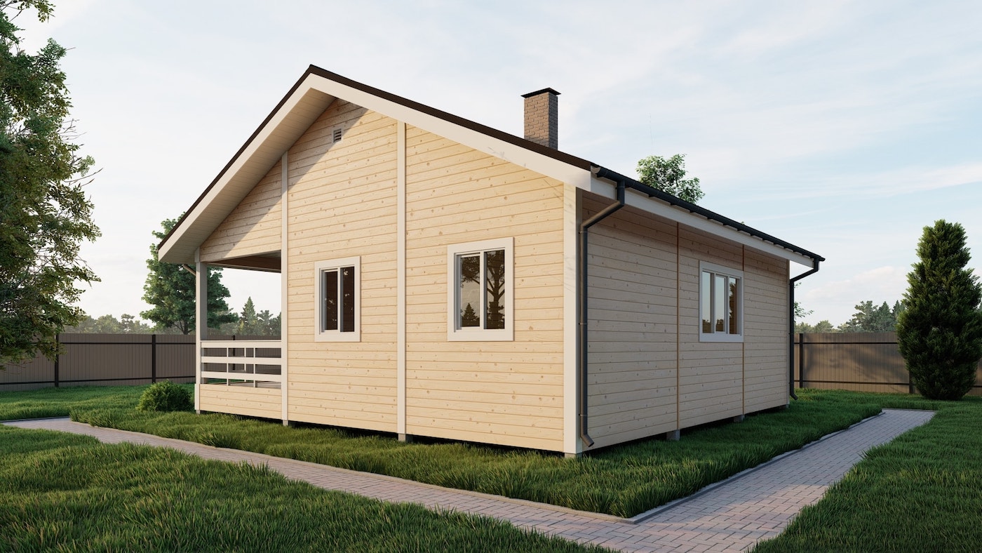 Двухскатная, конек 3 м. Фронтоны обшиты имитацией бруса |